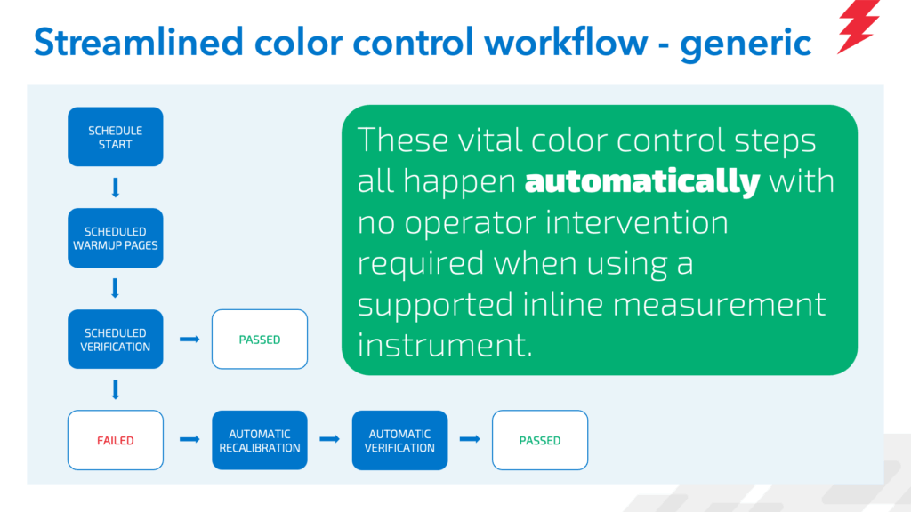 The newest version of Fiery ColorGuard takes color control from a manual hassle to a fully automated, behind-the-scenes process. Designed to work seamlessly with inline measurement instruments in presses, it verifies, corrects, and maintains color output across your devices without stopping production or requiring operator input.