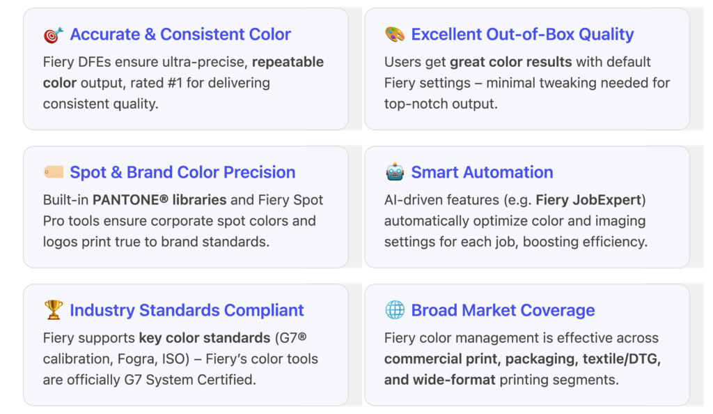 Fiery color management provides a comprehensive, field-proven system that brings together scientific rigor, practical innovation, and industry alignment. Its key strengths – from accurate and consistent output to powerful spot color handling and automation – empower users across commercial, packaging, textile, and large format printing to produce top-tier results. Meanwhile, Fiery’s relentless pursuit of excellence is evident in how we’ve pioneered solutions for each print segment, ensuring that whether you’re printing a brochure, a cereal box, a custom T-shirt, or a trade show banner, your Fiery DFE delivers the color exactly as intended.