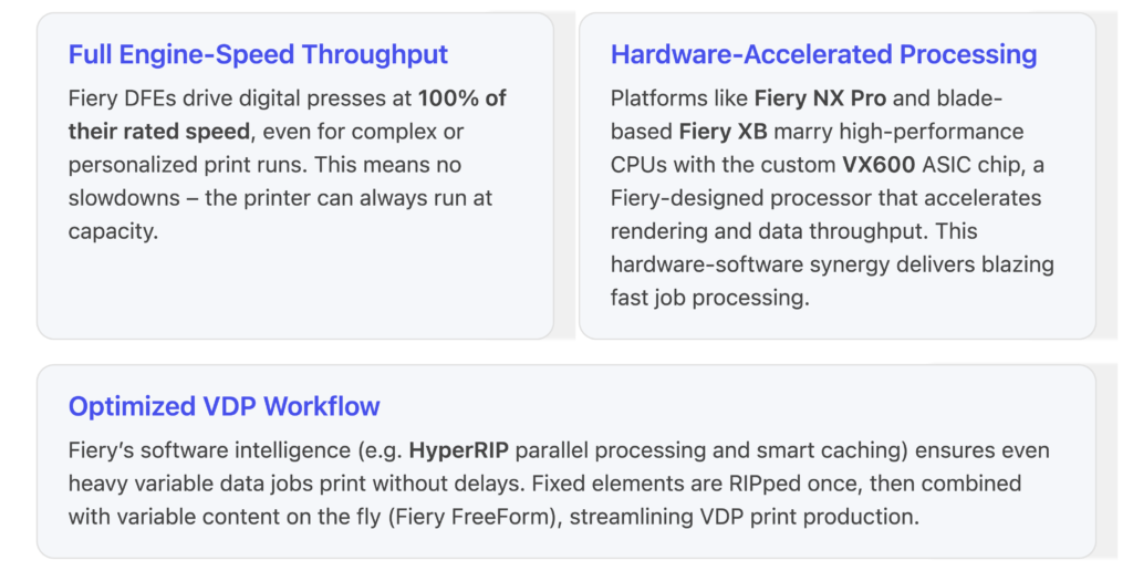 At Fiery R&D, we strive to give printers powerful DFEs that help them perform to their fullest potential. This means keeping machines running at their highest rated speeds, while achieving maximum print quality – even for their most challenging complex print jobs.