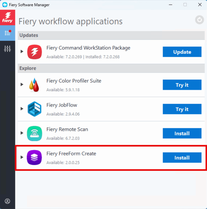 Fiery FreeForm Create está disponible como parte de Fiery Software Manager, una pequeña aplicación que permite descargar, instalar, actualizar y eliminar diversas aplicaciones y soluciones de software de Fiery. Si ya tiene Fiery Command WorkStation instalado, Fiery Software Manager también lo está.