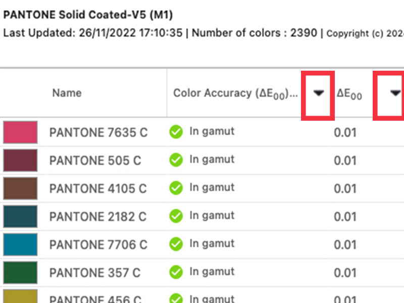 Sort columns (Name, Color Accuracy, dE) in the main Spot Pro window in ascending or descending order to find specific colors faster.